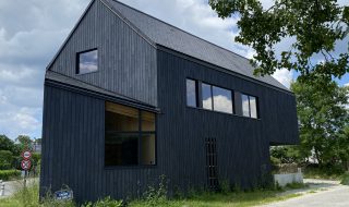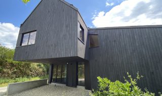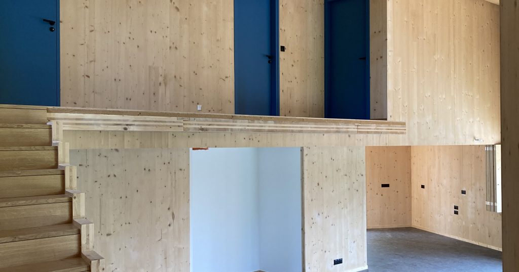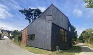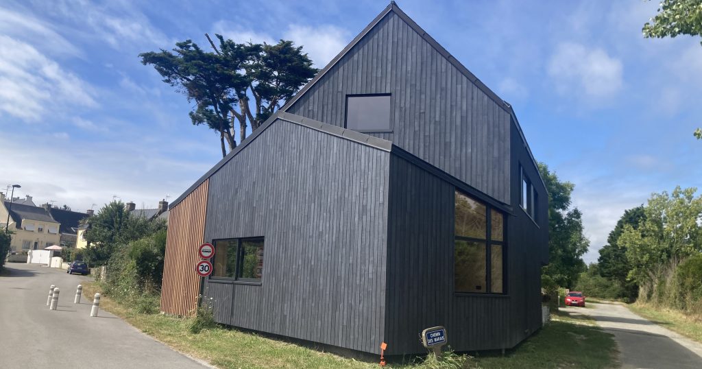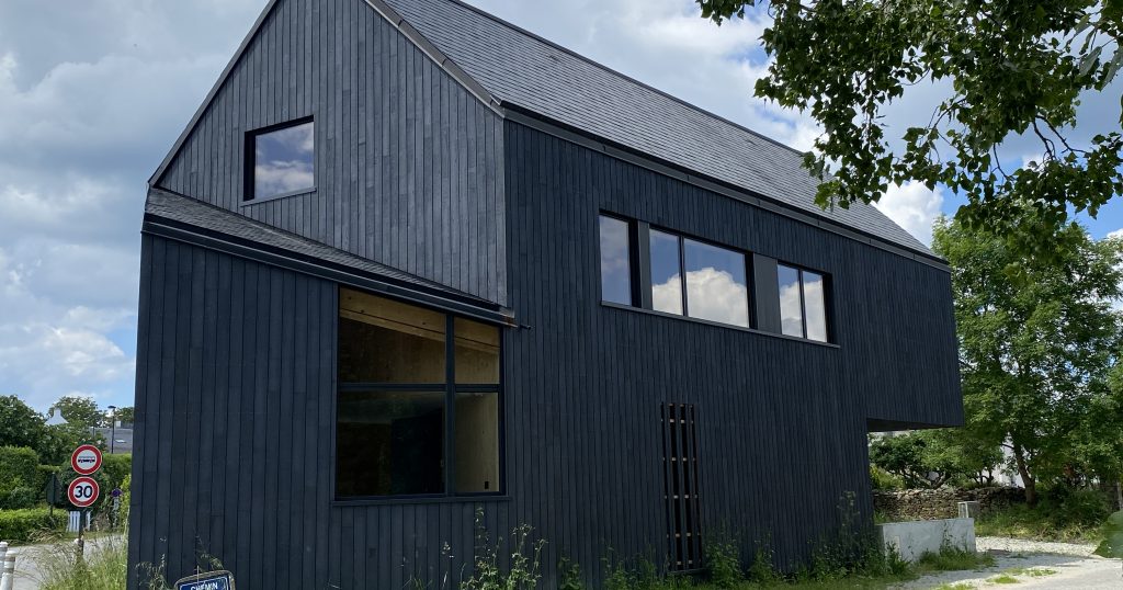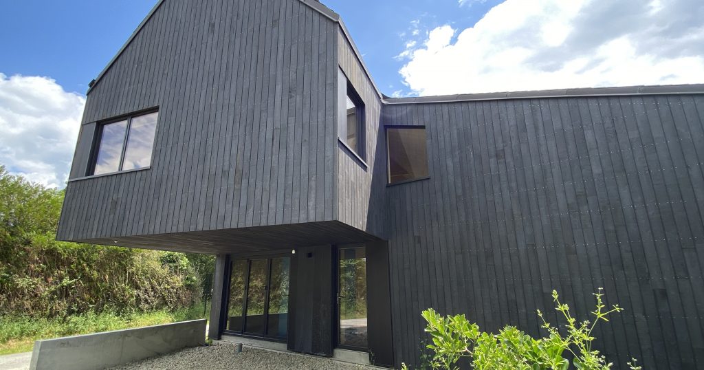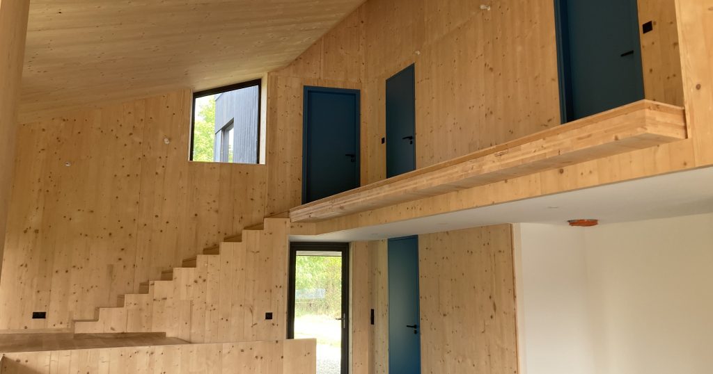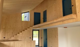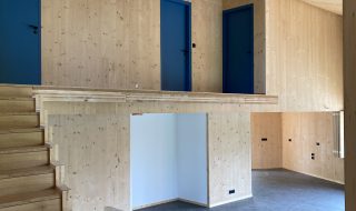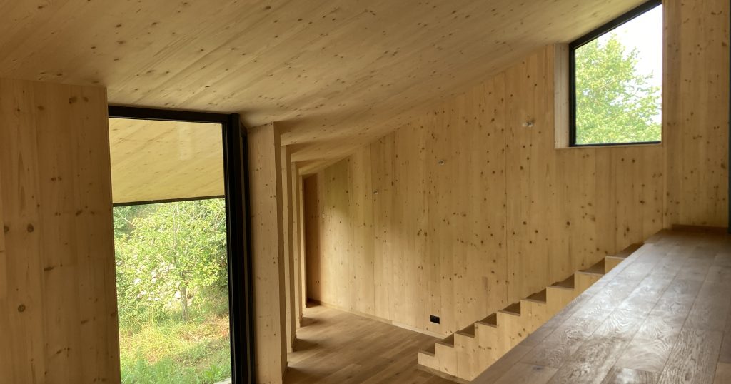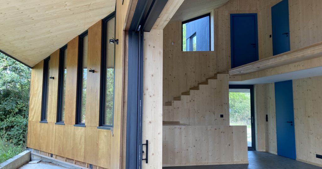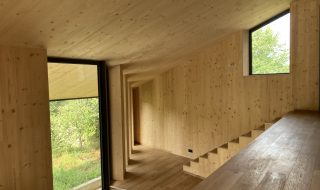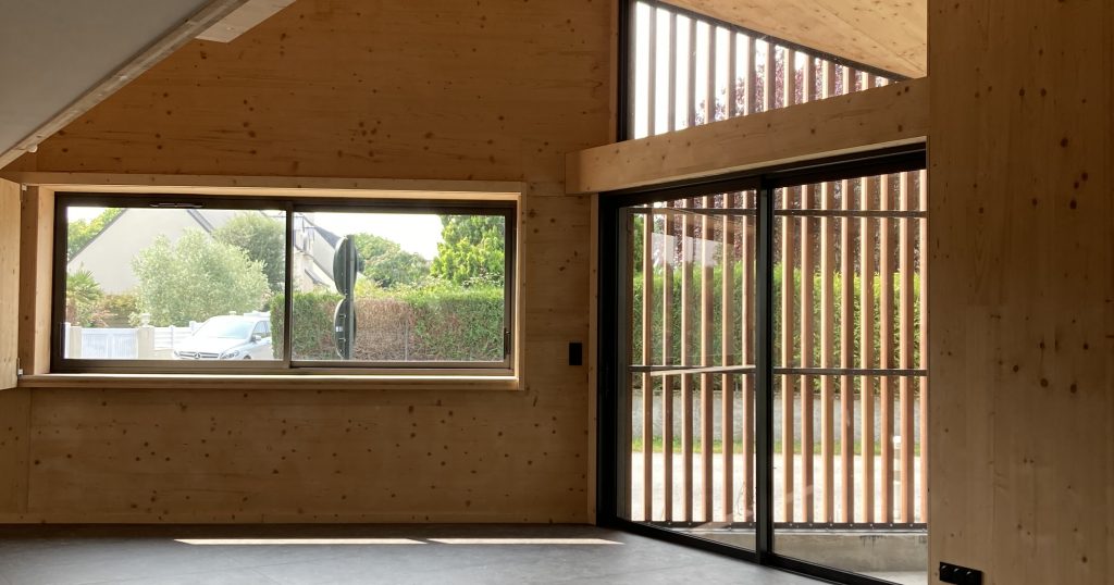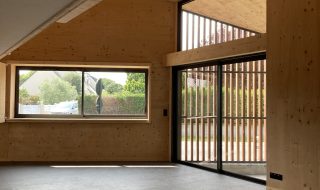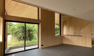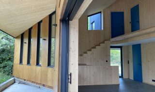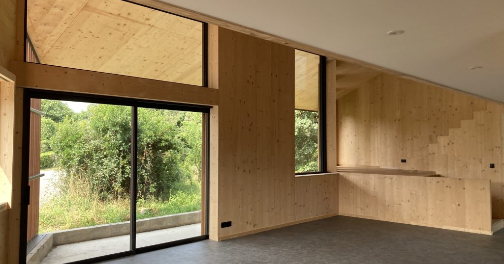 - L’auvent est en console grâce à l’association par collage structurel du panneau CLT et de nervures en Bois Lamellé Collé.