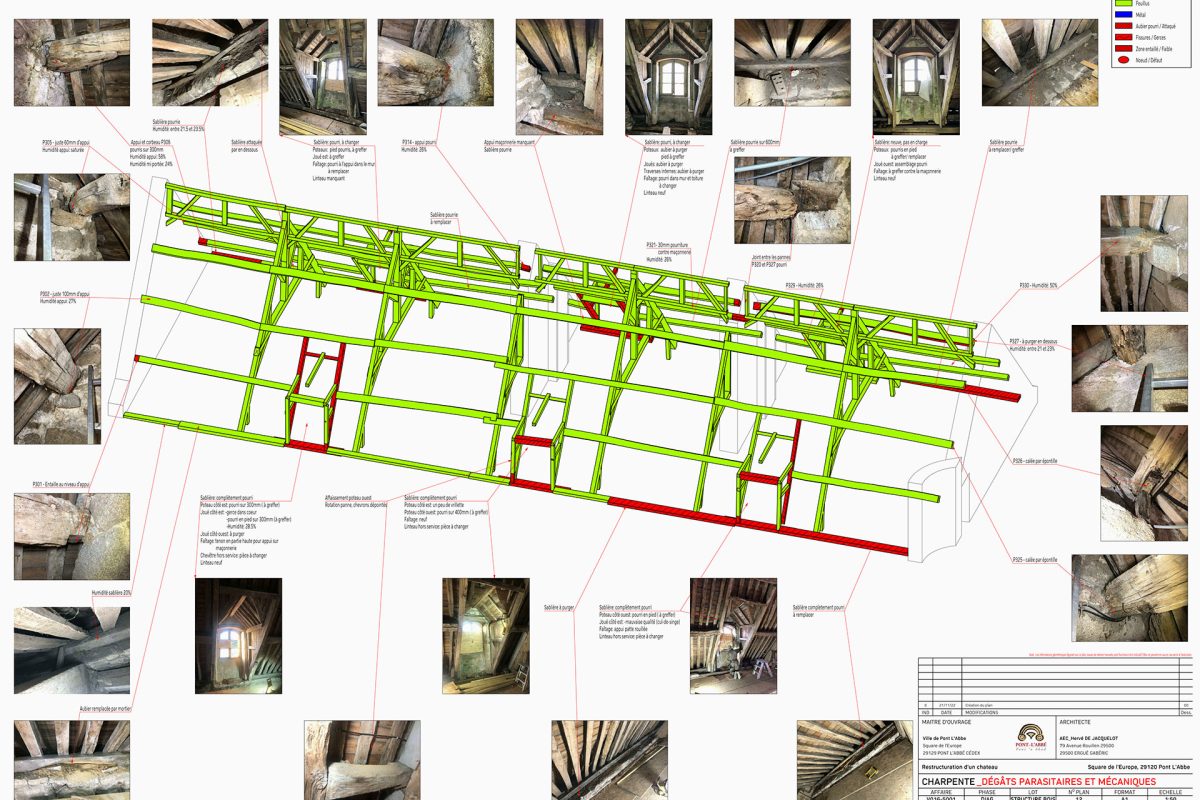 Sur site, nous effectuons le relevé de la géométrie de la structure par Scan 3D, un diagnostic détaillé de l’état parasitaire, et une analyse des désordres mécaniques ou des défauts de conception. Dans un deuxième temps, au bureau, la structure est modélisée afin d’analyser sa capacité de charge. Enfin, nous remettons au commanditaire un rapport avec la solution de réparation ou de renforcement la mieux adaptée, un estimatif du coût des travaux et les plans de principe.