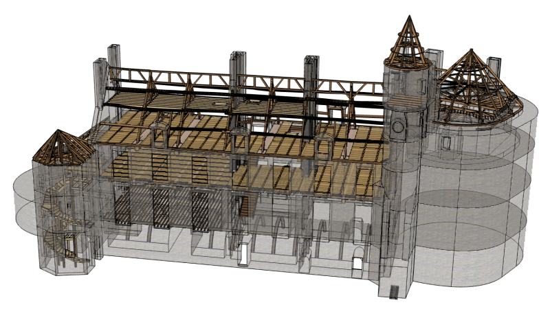 - Relevé géométrique réalisé à l’aide de la photogrammétrie pour les extérieurs et d’un scan 3D pour l’analyse de la structure en bois à l’intérieur avec rétroconception.